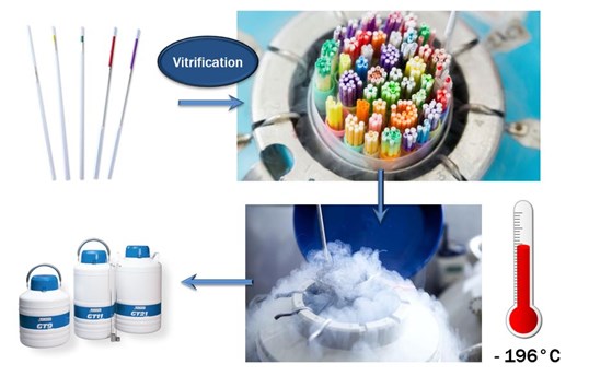 La technique employée est appelée vitrification : il s’agit d’un refroidissement ultra-rapide de l’embryon de 37°C à -196°C qui, à l’aide d’un milieu cryoprotecteur, pourra être mis au repos puis conservé sous forme de paillette, plongée dans une cuve d’azote liquide, et sans limite de durée.