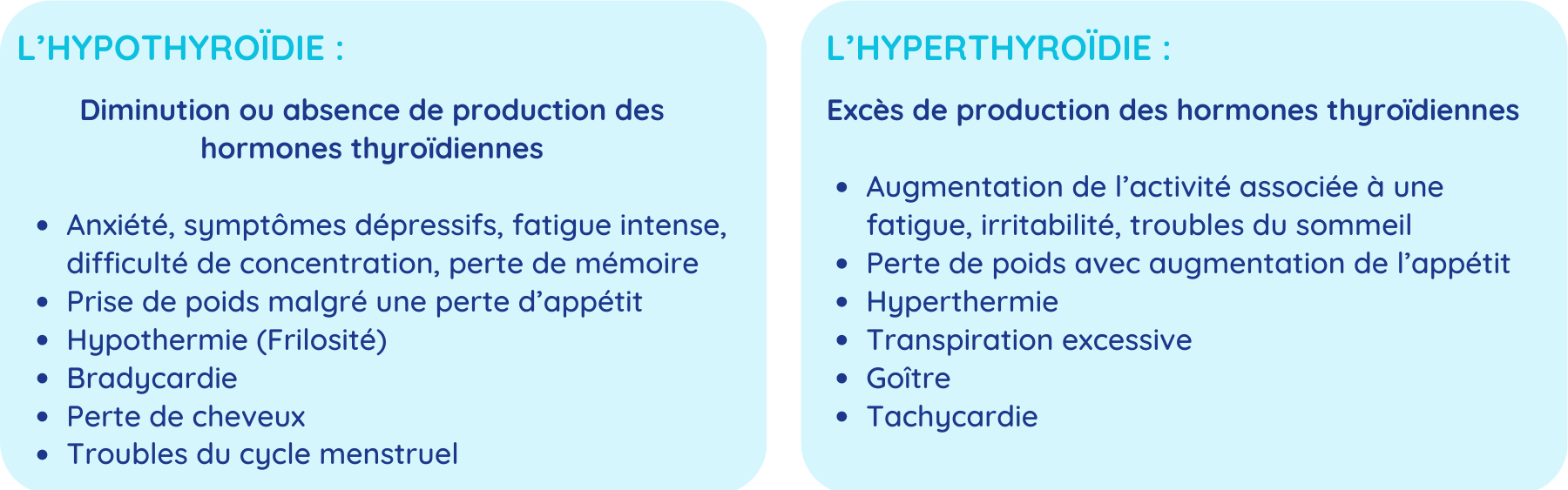 Un trouble du fonctionnement normal de la glande thyroïde, ou dysthyroïdie, peut donc avoir de nombreuses répercussions avec divers symptômes.