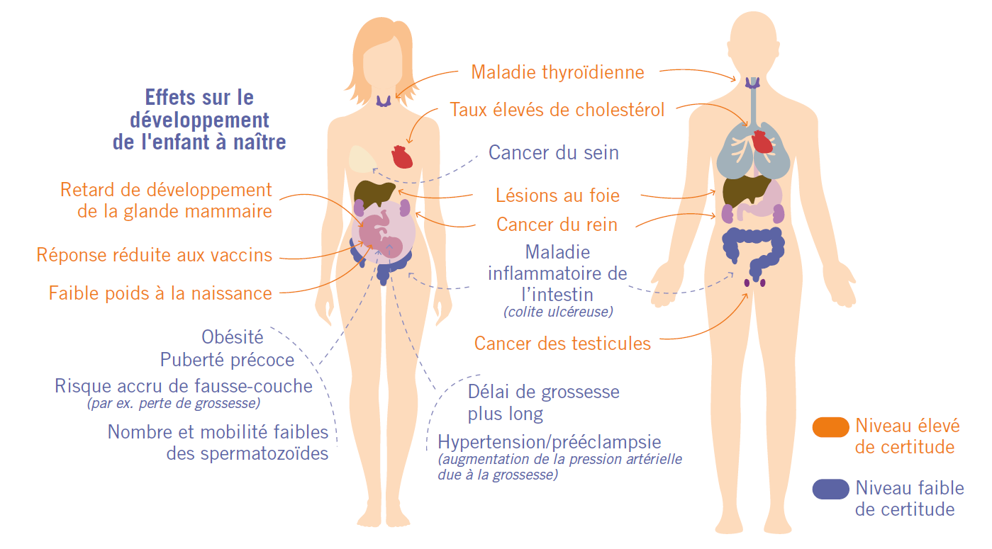 Les PFAS sont associés à divers risques pour la santé humaine et l'environnement. Ils peuvent causer des problèmes de santé tels que l'augmentation du taux de cholestérol, le cancer, les effets sur la fertilité et le développement du fœtus, ainsi que des impacts sur le foie et les reins. Ils sont également suspectés d'interférer avec le système endocrinien (thyroïde) et immunitaire.